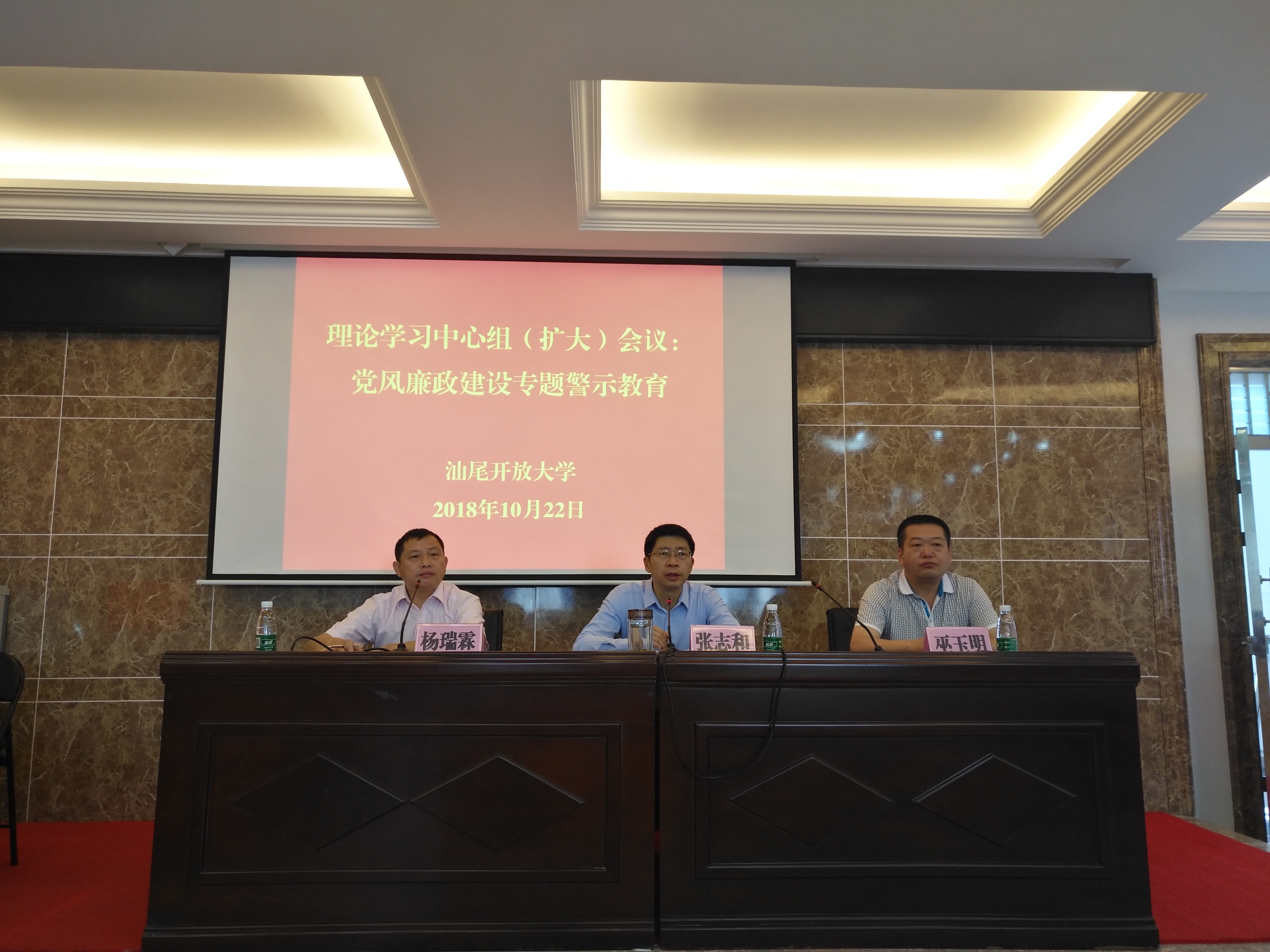 10月22日,我校召开理论学习中心组(扩大)会议,在党员和教职工中开展党风廉政建设专题警示教育,学校领导张志和、巫玉明、杨瑞霖出席,会议由张志和校长主持。