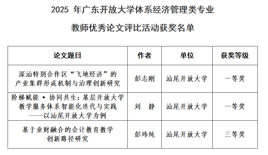2025年11月26日,广东开放大学公布了2025年度体系内专业教师优秀论文评选结果,我校三位教师的论文凭借扎实的研究功底与鲜明的创新价值,在众多参赛成果中脱颖而出,展现出深厚的专业素养与科研实力。其中,彭志刚老师撰写的《深汕特别合作区“飞地经济”的产业集群形成机制与治理创新研究》,立足区域经济发展前沿,依托“深圳主导、汕尾配合”的治理结构,为区域协调发展提供实证依据;刘静老师提交的《阶梯赋能 • 协同共生:基层开放大学教学服务体系智能化迭代与实践——以汕尾开放大学为例》,则系统探索了教学服务体系的智能化转型路径,体现了我校在教学改革与实践创新中的积极探索。以上两篇论文均荣获一等奖。此外,彭玮纯老师撰写的《基于业财融合的会计教育教学创新路径研究》,聚焦会计专业教学改革,荣获三等奖。