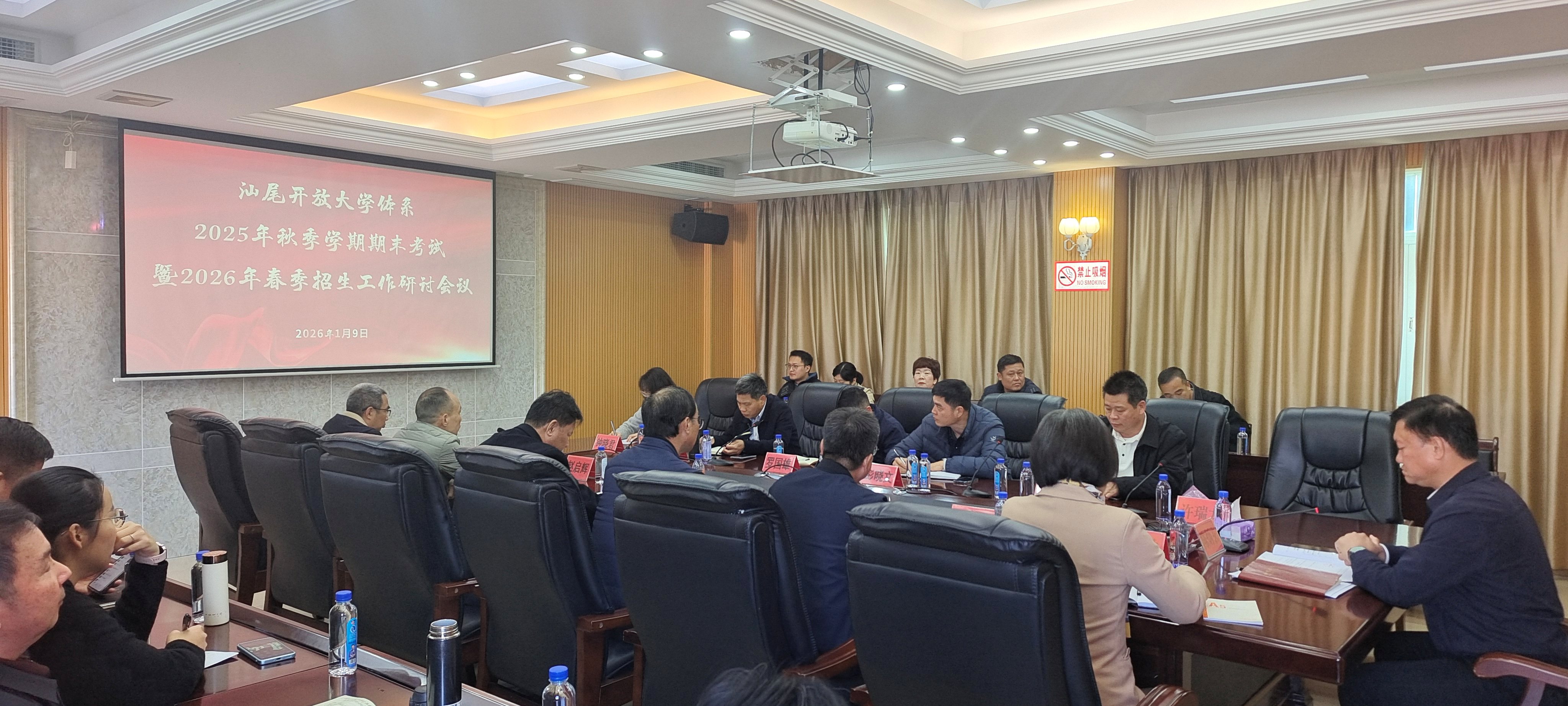 2026年1月9日上午,汕尾开放大学体系召开2025年秋季学期开放教育期末考试和2026年春季招生工作研讨会议。会议由汕尾开放大学党委书记、校长陈炳玄同志主持。学校党委委员、副校长谭书敬、许瑞龙同志,以及各县(市)开放大学校长、考务和招生工作的负责同志参加会议。