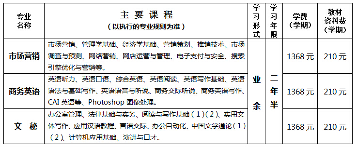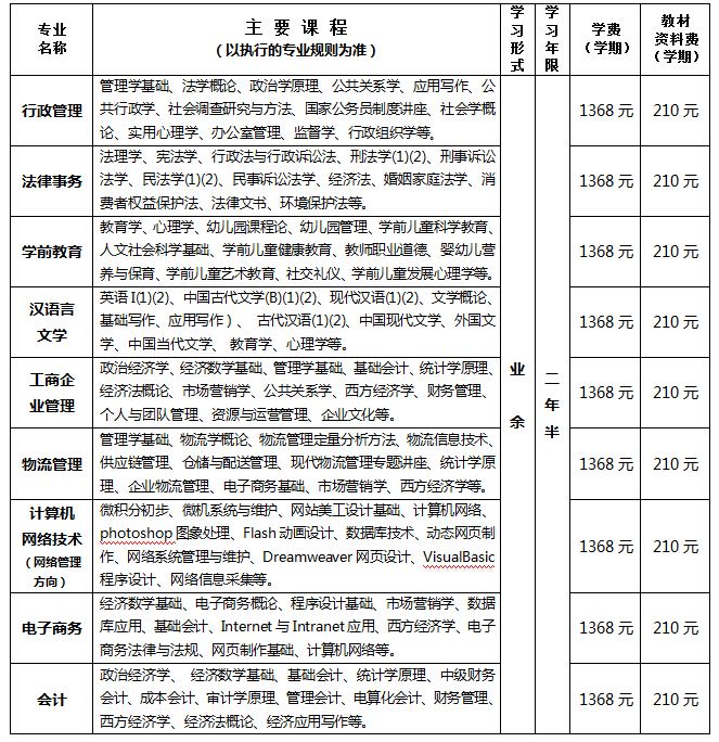 国家开放大学专科招生专业及收费一览表