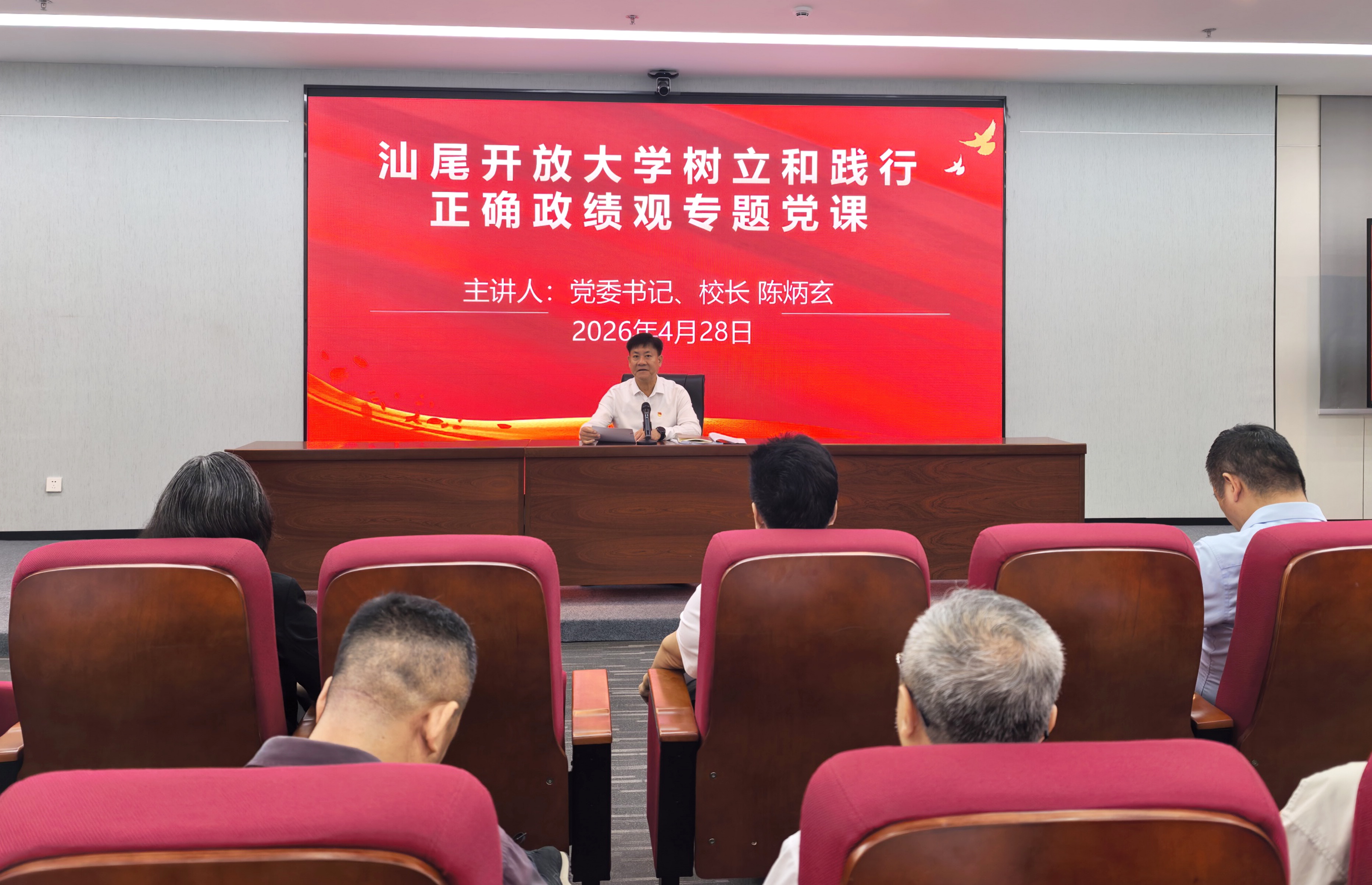 签署仪式完毕,全体人员移步至二楼廉政教育课堂,参加专题党课学习。汕尾开放大学党委书记、校长陈炳玄作总结讲话,并以“树立和践行正确政绩观”为题讲授专题党课。