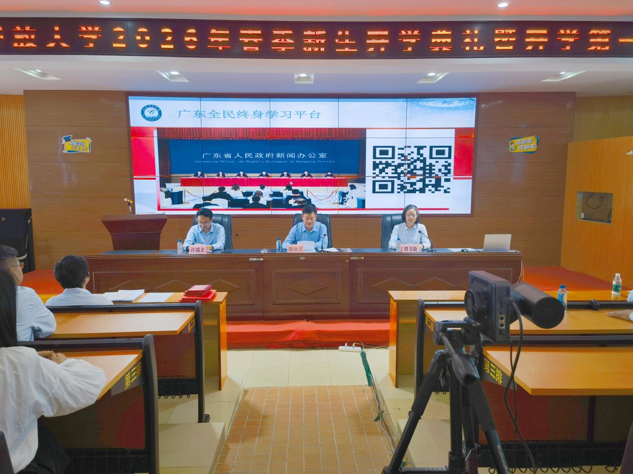 4 月 26 日,汕尾开放大学隆重举行 2026 年春季新生开学典礼。汕尾开放大学党委书记、校长陈炳玄出席活动,并为汕尾开放大学全体新生讲授思政第一课,重点推介广东省全民终身学习平台,引导广大学子融入全省终身学习生态,以学赋能、以行践知。