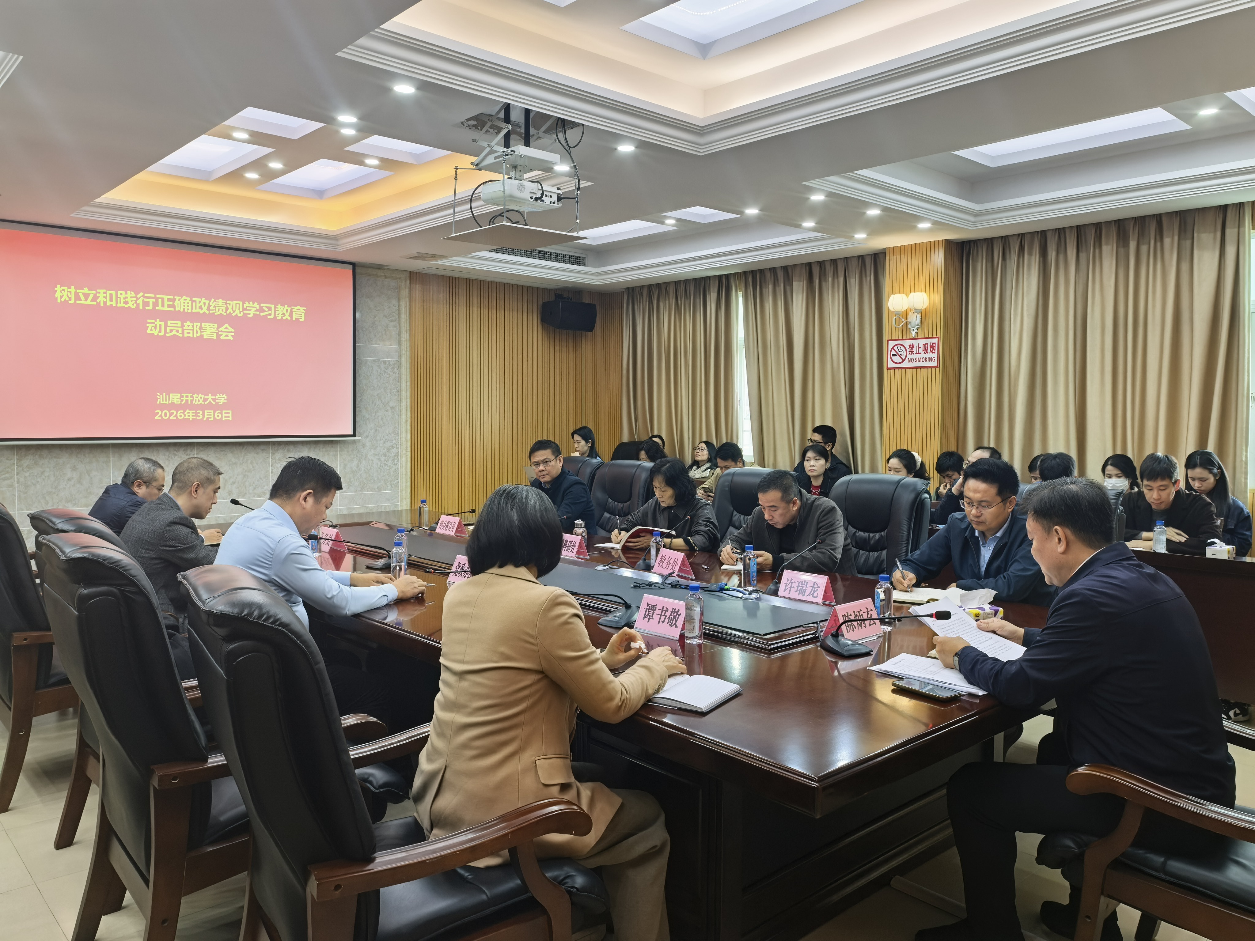 3月6日上午,汕尾开放大学召开树立和践行正确政绩观学习教育动员部署会,深入学习贯彻习近平总书记关于树立和践行正确政绩观的重要论述精神,传达学习中央办公厅《关于在全党开展树立和践行正确政绩观学习教育的通知》和中央党的建设工作领导小组会议以及省委、市委相关会议精神,动员部署学校学习教育有关工作。校党委书记、校长陈炳玄主持会议并讲话,全体教职员工出席会议。