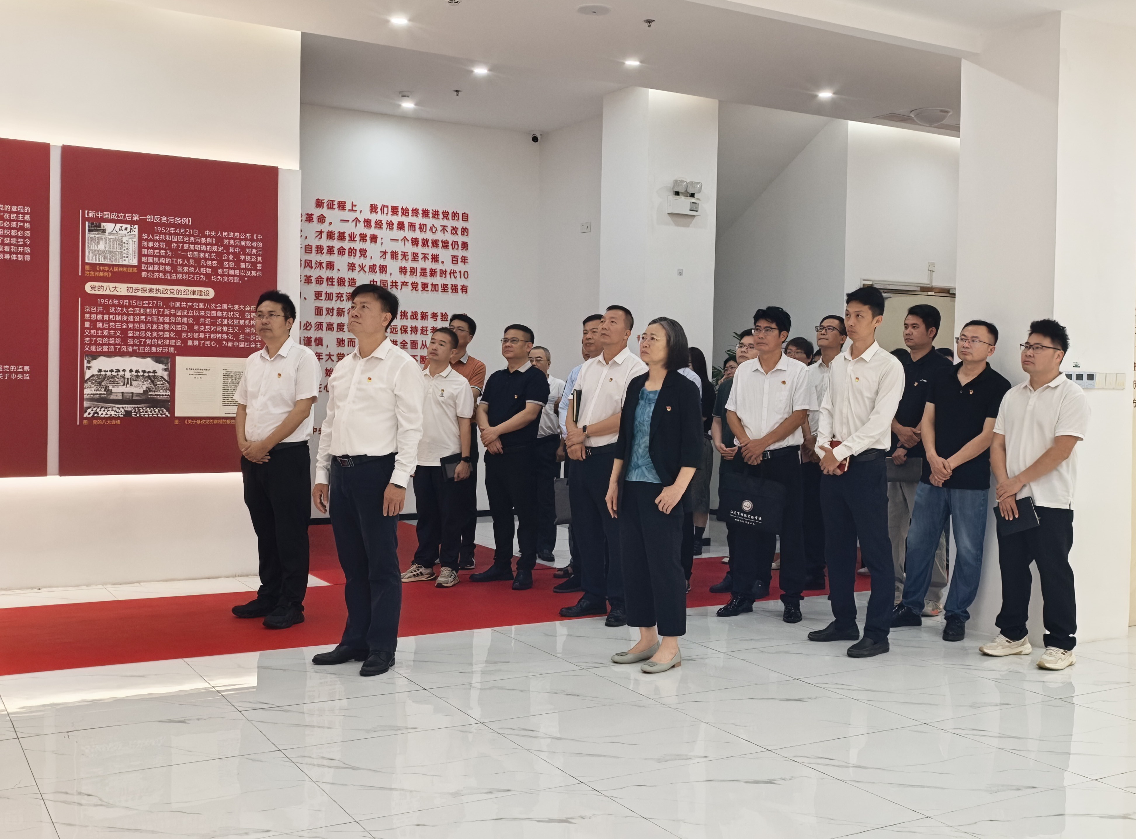 参观结束后,在第四展厅尾厅,由汕尾开放大学党委书记领誓,全体党员面向党旗,庄严地举起右拳,重温入党誓词。铿锵有力的誓言响彻展厅,表达了不忘初心、牢记使命的坚定信念。随后,在讲解员的引导下,大家郑重签署了《廉政勤政承诺书》,承诺将时刻保持清醒头脑,严守纪律底线,做到清正廉洁、勤勉奉献。
