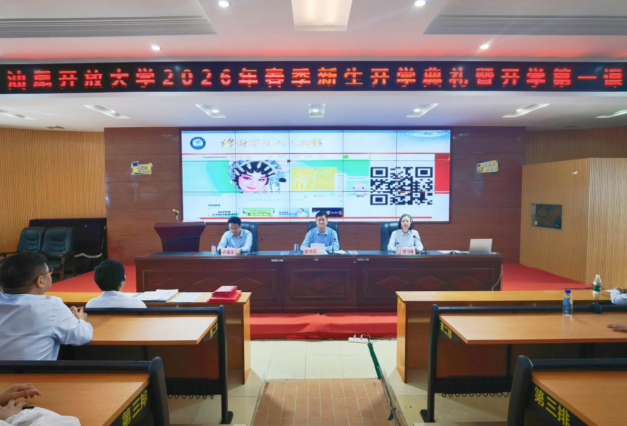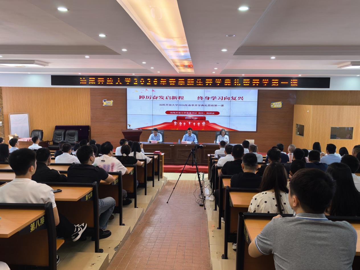 4 月 26 日,汕尾开放大学隆重举行 2026 年春季新生开学典礼。汕尾开放大学党委书记、校长陈炳玄出席活动,并为汕尾开放大学全体新生讲授思政第一课,重点推介广东省全民终身学习平台,引导广大学子融入全省终身学习生态,以学赋能、以行践知。