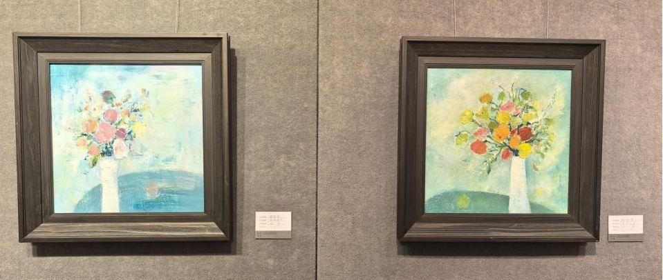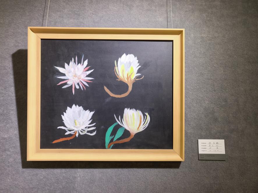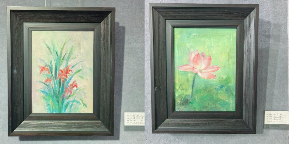 我校骆彩琼老师的油画作品《蓝境花束》《绿意春声》《清涧兰开》与《荷语》受邀展出。《清涧兰开》以写意的笔触描绘了兰花在微风中摇曳的姿态,色彩明快,充满生机。而《荷语》则捕捉了荷花亭亭玉立的瞬间,粉嫩的花瓣与朦胧的背景相映成趣,传递出一种静谧而优雅的美感。林志鹏老师作为我校社区教育美术班的一名成员,他油画的作品《昙花一现》,用极简的构图,纯粹的色彩,呈现了昙花盛开的过程。含苞的张力、盛放的热烈,每个状态都是生命最本真的模样。